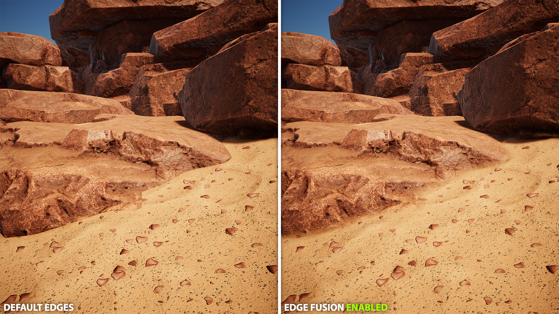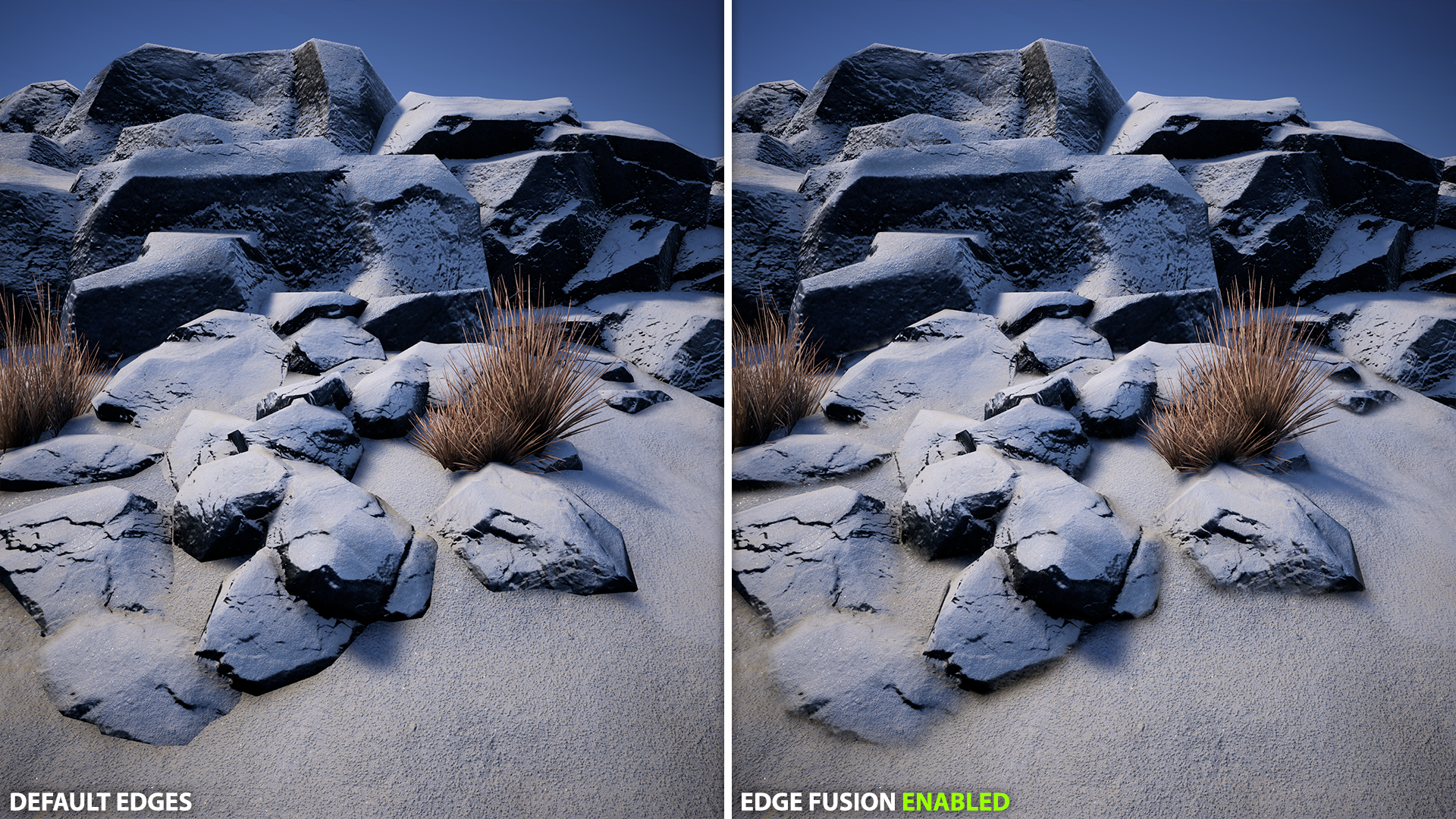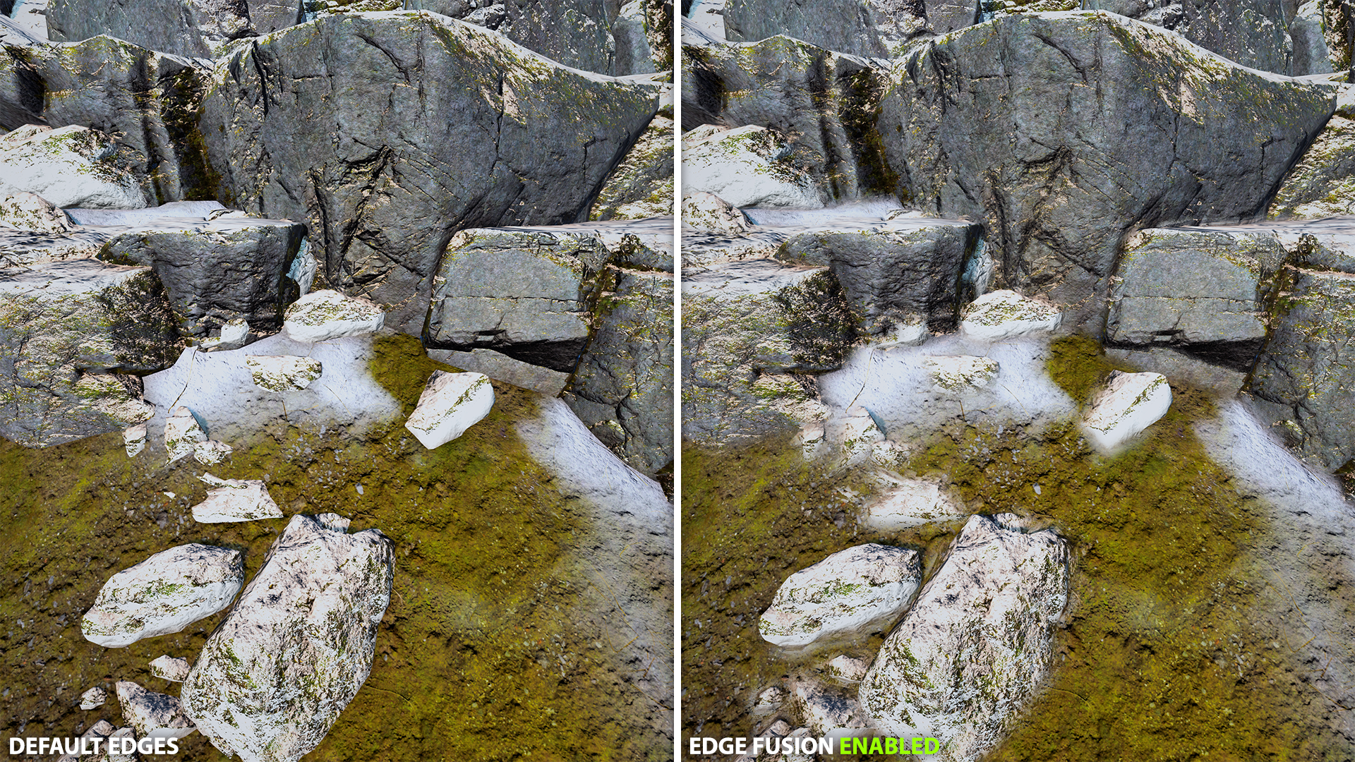 - Edge blending: smooths transitions between meshes, terrain, and props without changing materials or geometry.