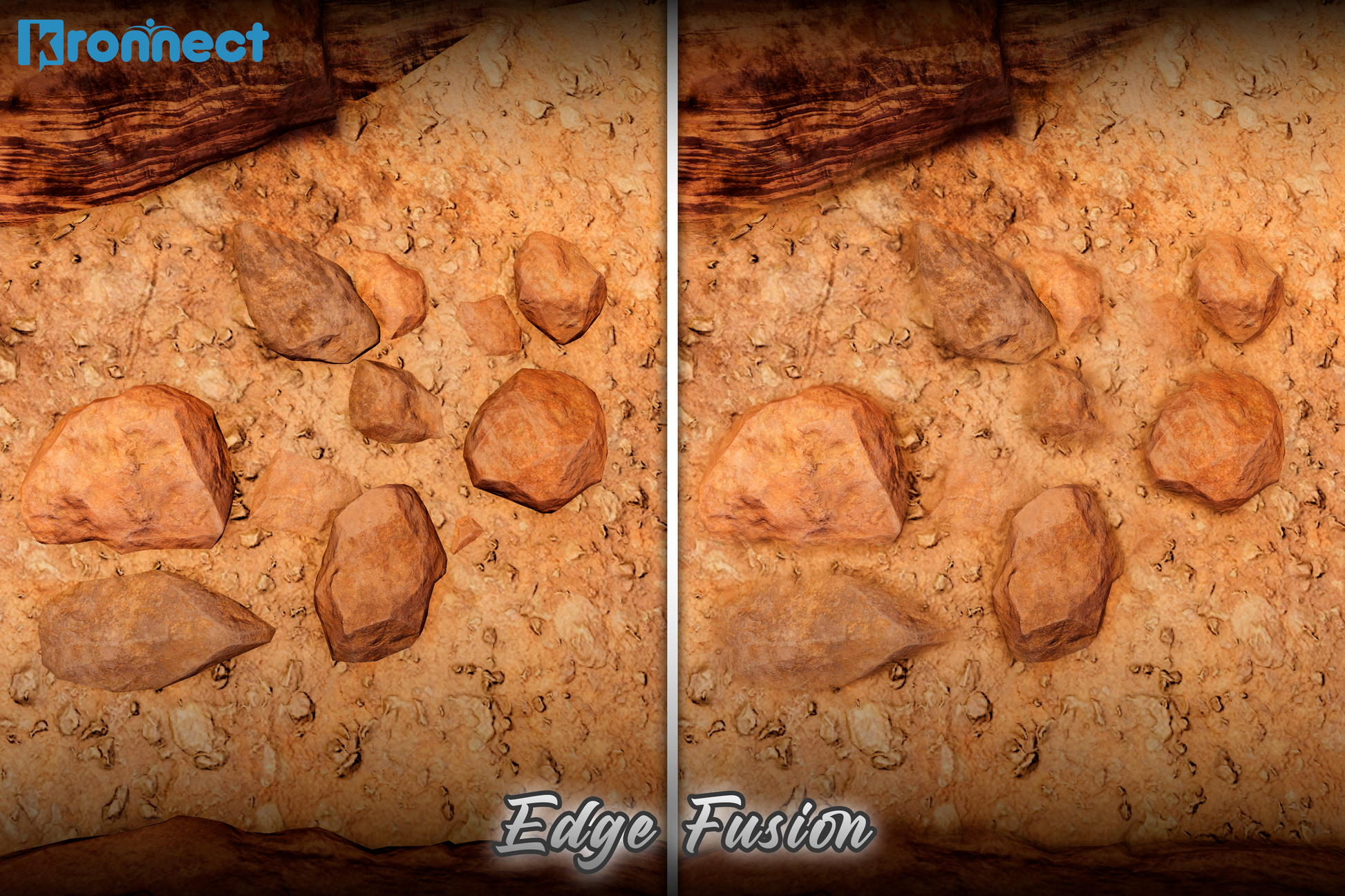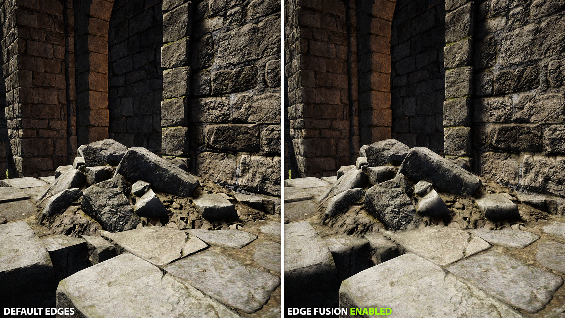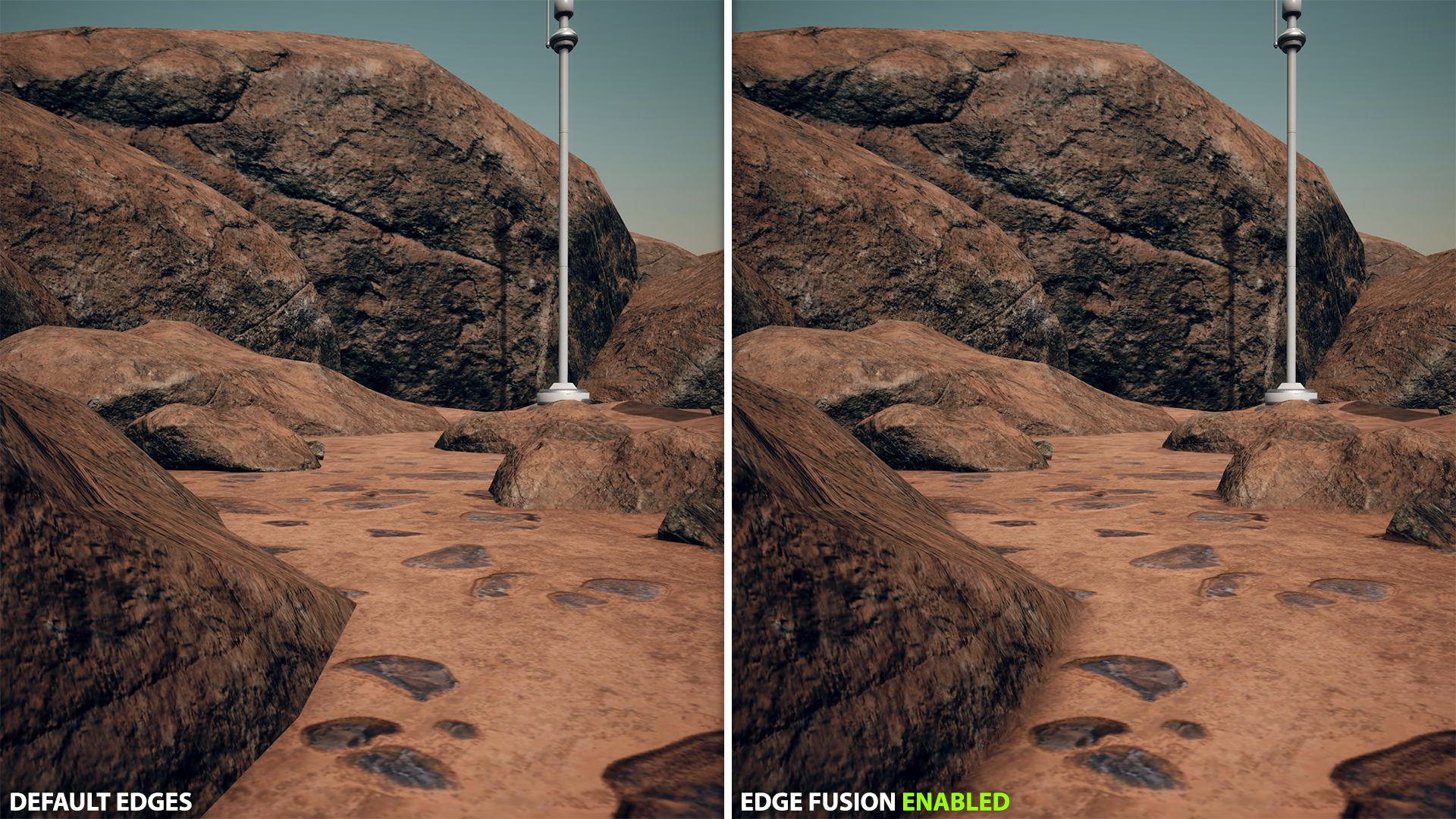 - Edge blending: smooths transitions between meshes, terrain, and props without changing materials or geometry.